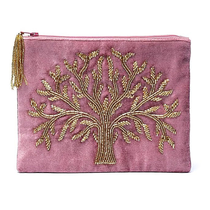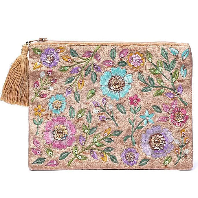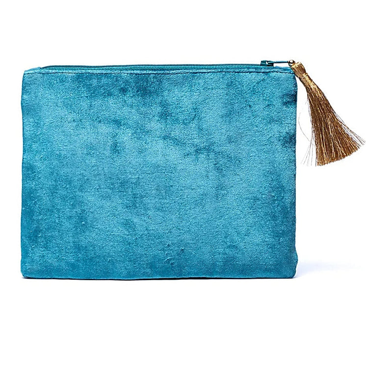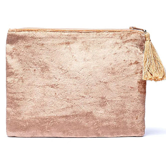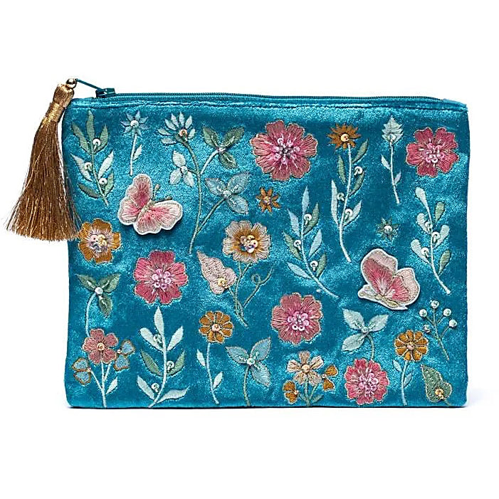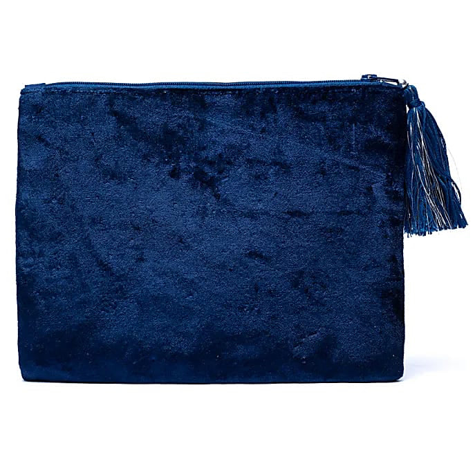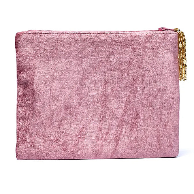 Back view of a Voglio Bene Possesso velvet pouch, size 17 × 23 cm. The image features a dark floral pattern as a decorative background.