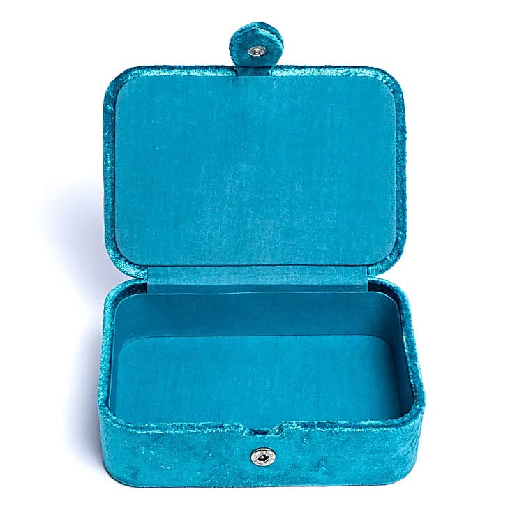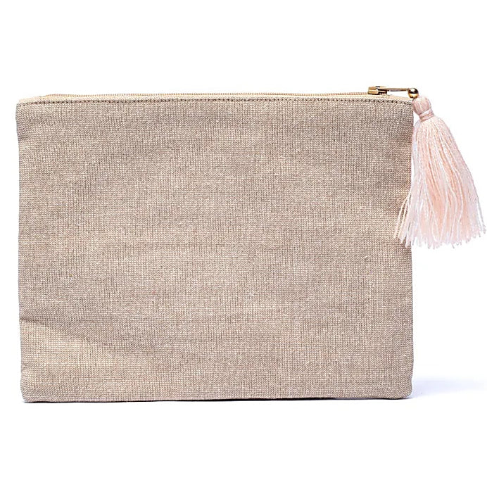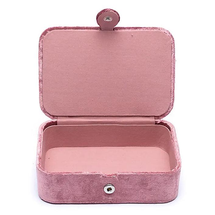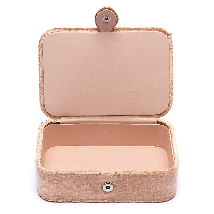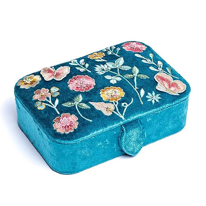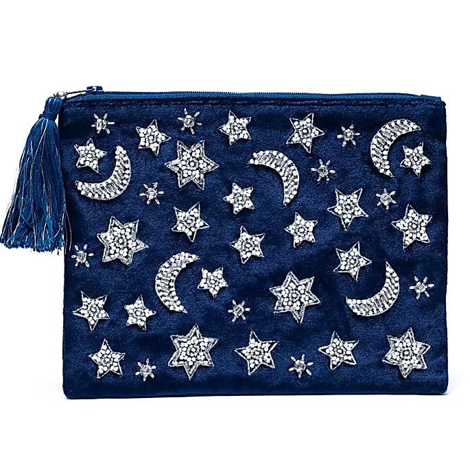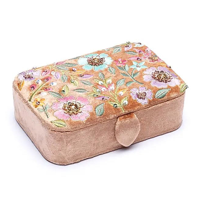 Back view of a Voglio Bene Possesso velvet pouch, size 17 × 23 cm. The image features a dark floral pattern as a decorative background.
