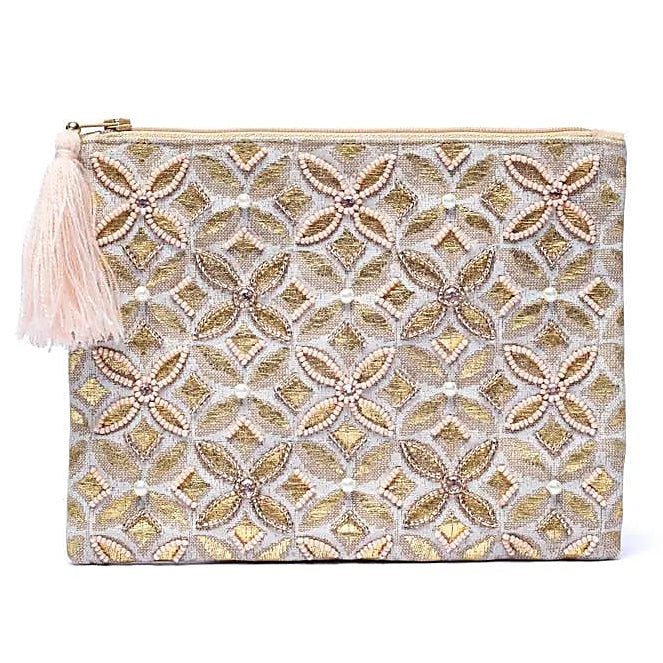 Back view of a Voglio Bene “La Vida es un Sueño / The Life” purse, featuring hands and floral ornaments repeated as a decorative background.