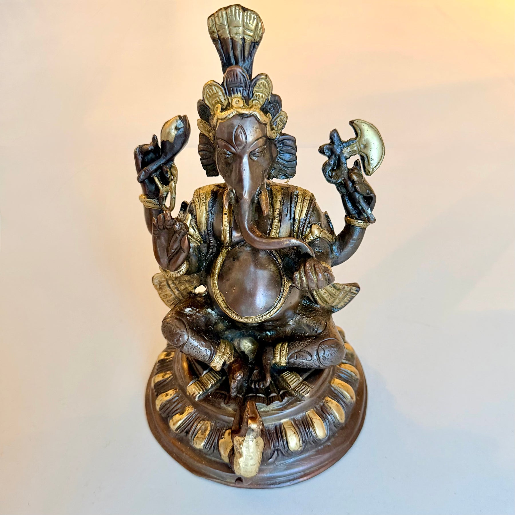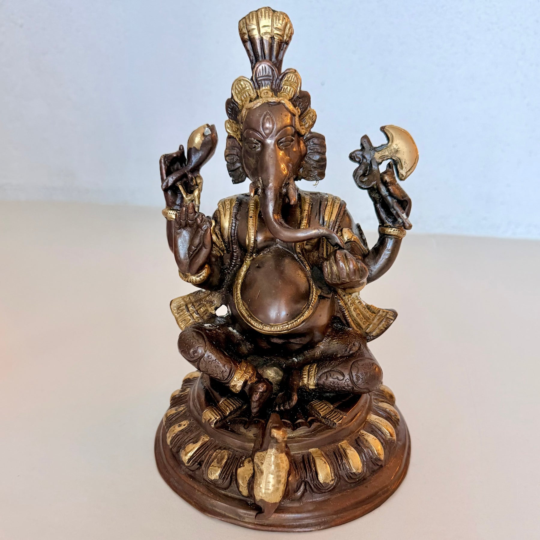 Tämä näyttävä ja painava metallivalettu Ganesha on vintage-esine, ajoittuen todennäköisesti 1900 luvun jälkipuoliskolle. Pinnan kulumat kertovat ajasta ja käytöstä. Se soveltuu tilaan, jossa halutaan harkintaa, suotuisia alkuja ja viisasta etenemistä.