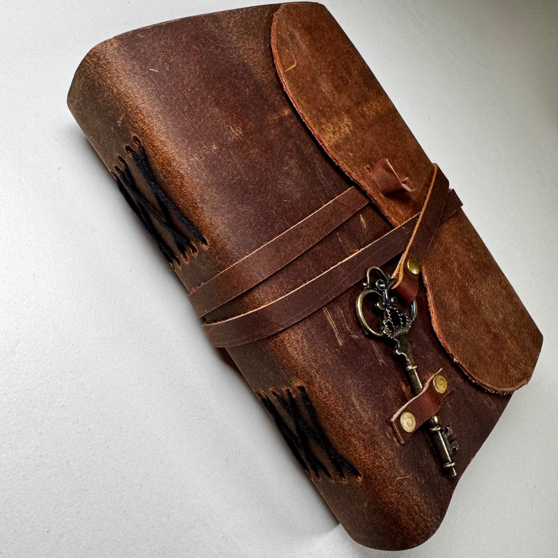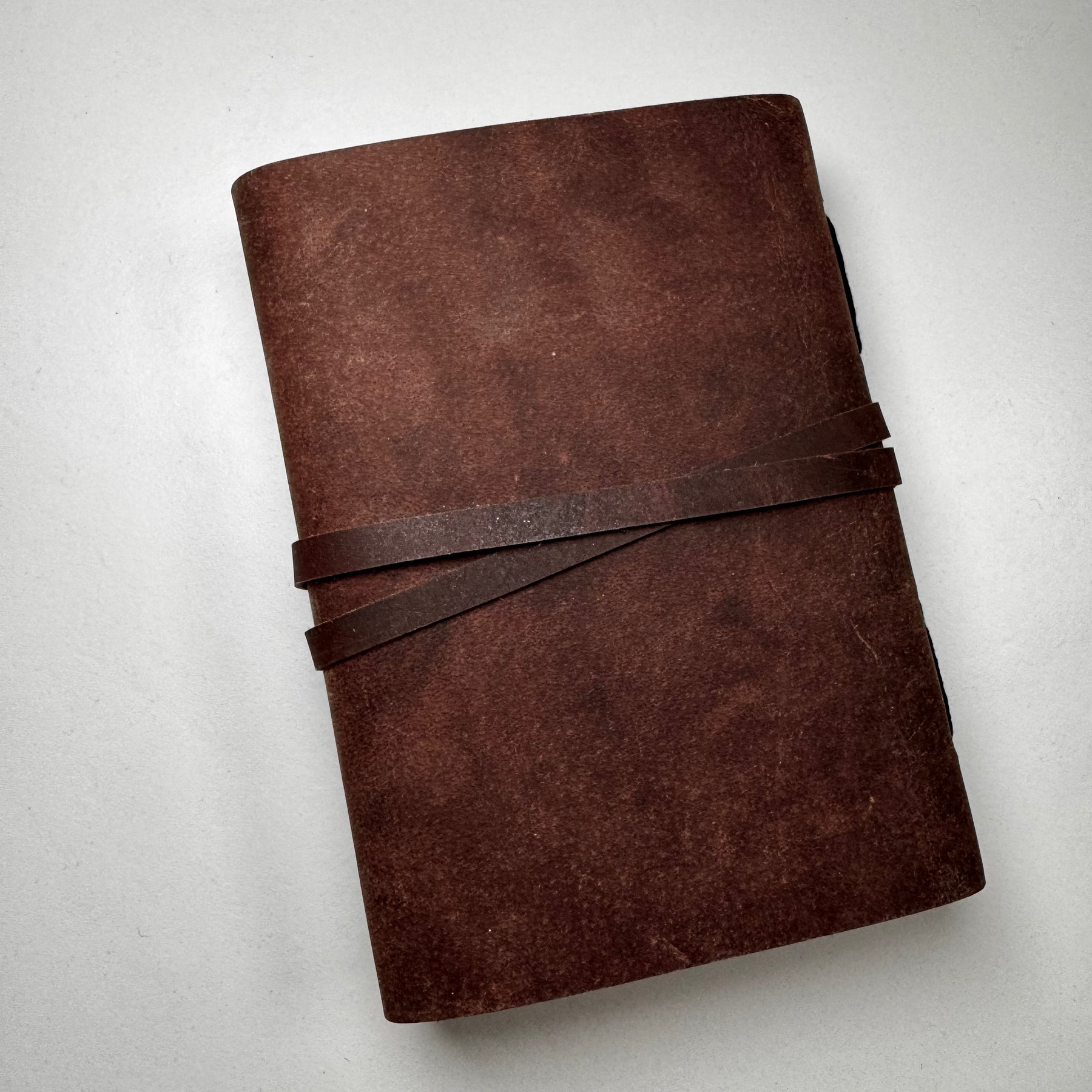 Upea, rustiikkinen käsityönä nahasta valmistettu muistikirja. Kirjan sivut on käsintehdystä paperista, joka tarjoaa ainutlaatuisen tekstuurin ja kirjoituskokemuksen.