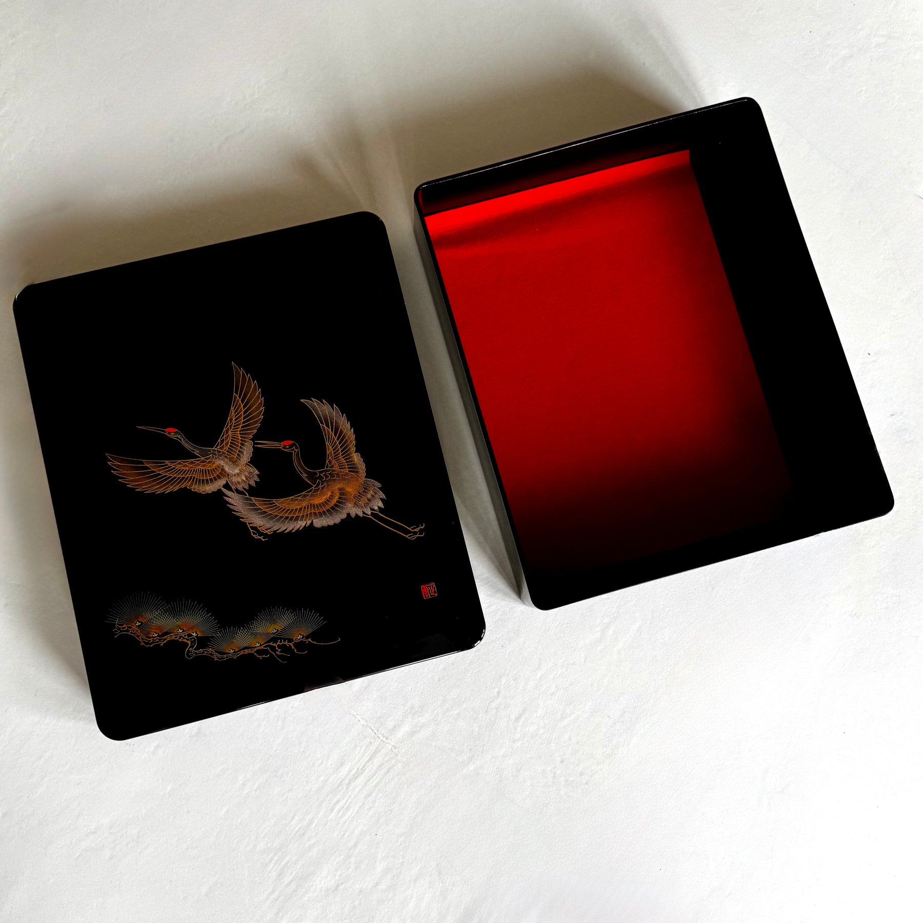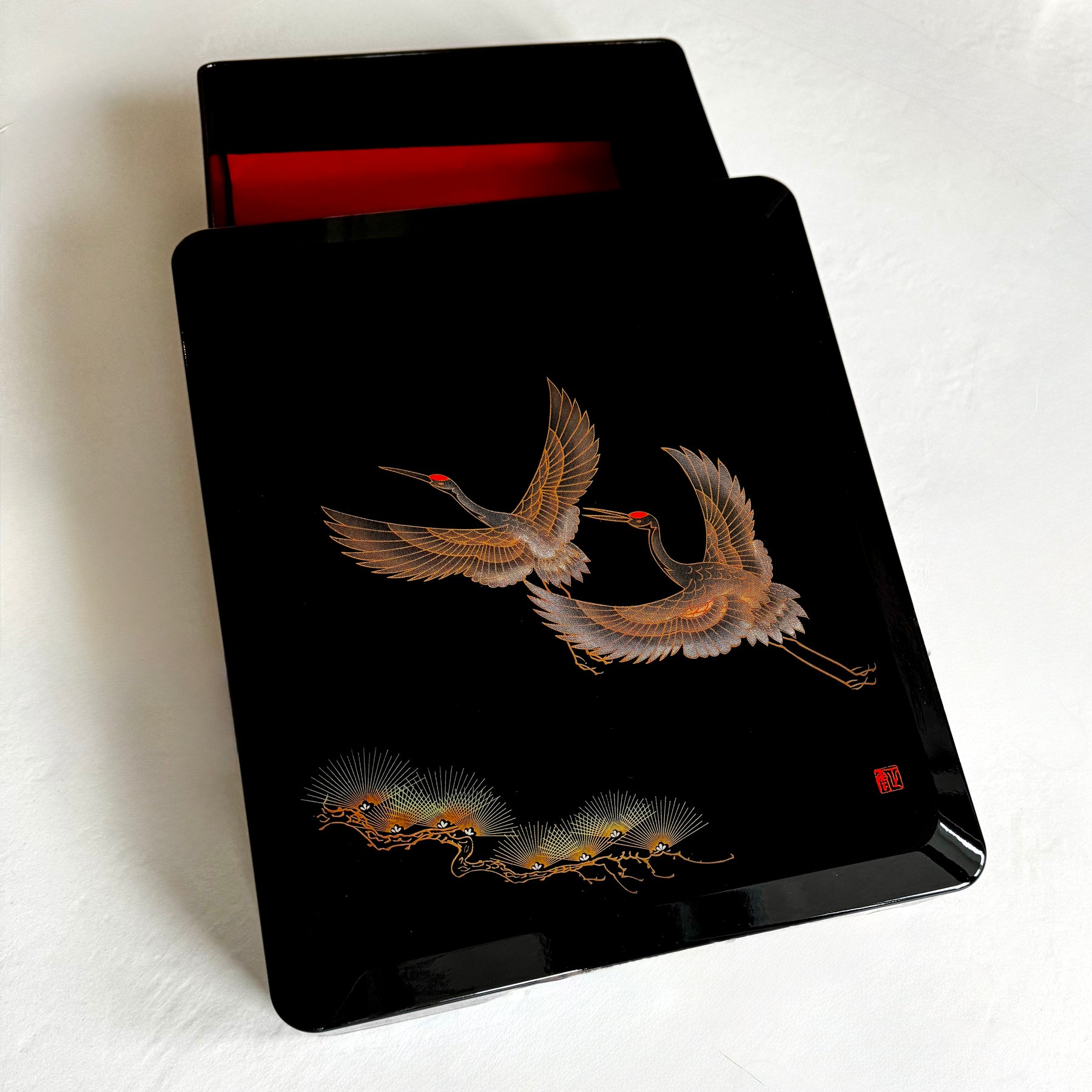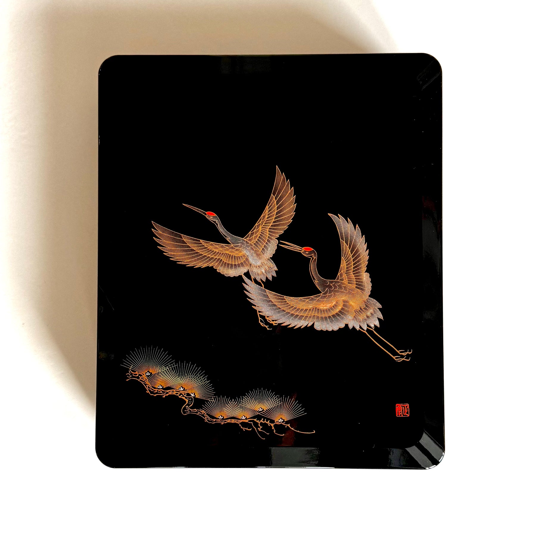 Laatikon kantta koristavat lentävät kurjet ja tyylitellyt männyt. Kulmassa on punainen taiteilijan sinetti. Kurki symboloi japanilaisessa kulttuurissa pitkäikäisyyttä, onnea ja uskollisuutta, mänty puolestaan kestävyyttä ja elämän jatkuvuutta. Näiden elementtien yhdistelmää on perinteisesti käytetty esineissä, joilla toivotetaan onnea ja pitkää ikää.
