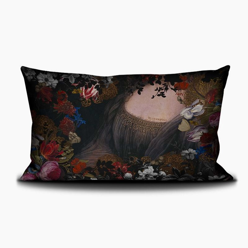 Voglio Benen upea, korkealuokkainen tyynynpäällinen 'Misteriosa' -painatuksella. Etu- ja takapuolella eri painatukset.