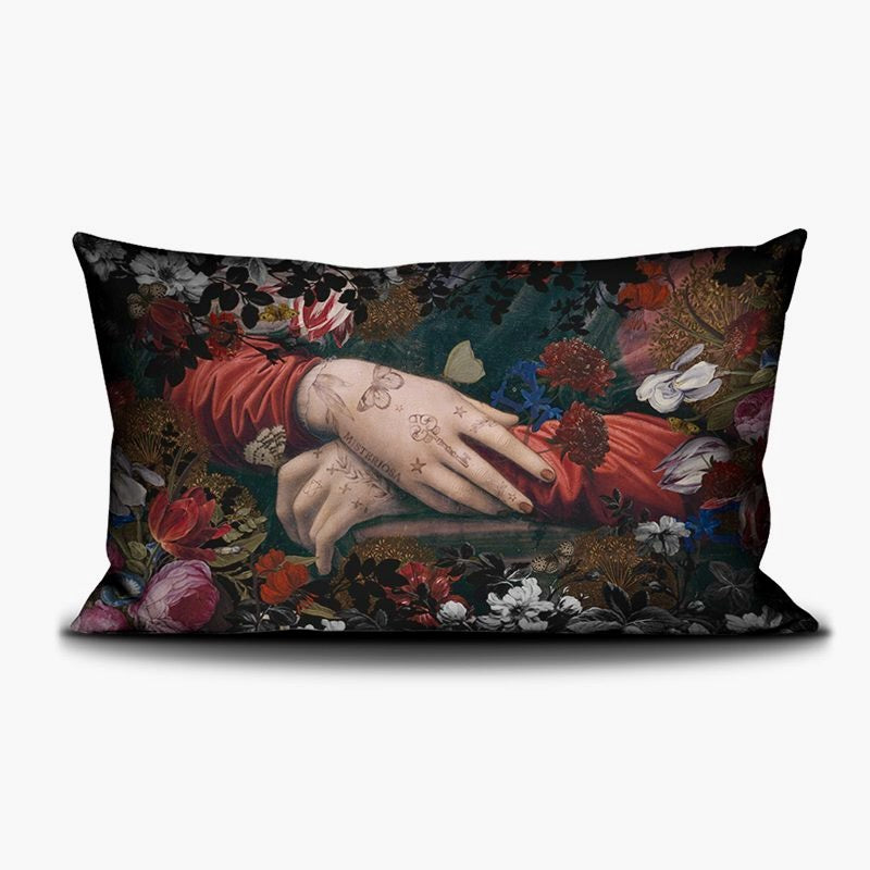 Tyynynpäällisen kuvioinnissa nähdään tatuoidut kädet ja mystisiä symboleita, kuten sana "MISTERIOSA". Kukkien yhdistelmä symboloi henkilökohtaista ilmaisua ja elämän monimuotoisuutta. Kädet ja kukat yhdessä luovat teeman kauneudesta ja katoavaisuudesta, jota tummien ja kirkkaiden värien kontrasti syventää, tuoden esiin elämän dualistisen luonteen – kauneuden ja pimeyden rinnakkaisuuden. Käsien asennot viittaavat suojeluun ja yhteyteen, symboloiden samalla myös vakautta.