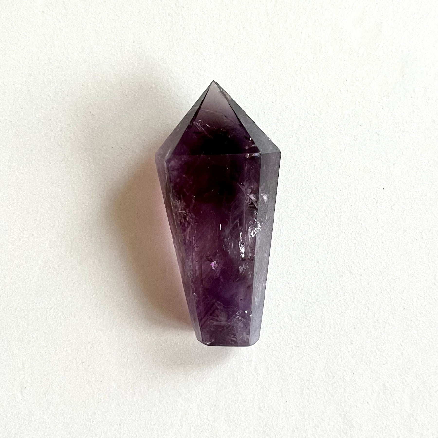 Kiillotettu ametistikärki AA-laatua, syvän violetin sävyissä ja selkeillä kvartsimuodostelmilla. - Polished AA-grade amethyst point with deep purple tones and well-defined quartz formations.