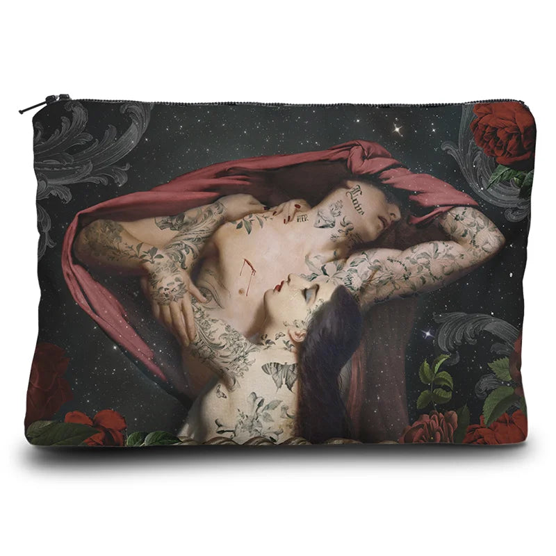 A stunning purse by Voglio Bene, featuring richly detailed imagery printed on polyester fabric. The front and back display different prints, and the piece is finished with a zip closure and lined interior.