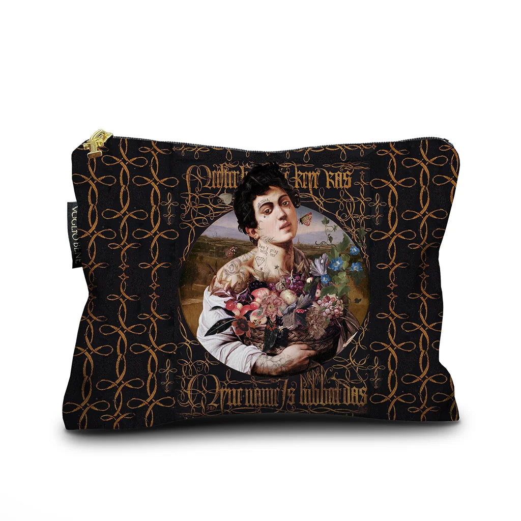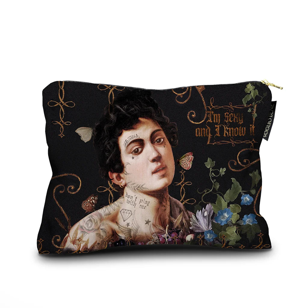 A stunning, high-quality velvet pouch by Voglio Bene, featuring the I'm Sexy artwork. Different prints adorn the front and back. Finished with a zip closure and inner lining.