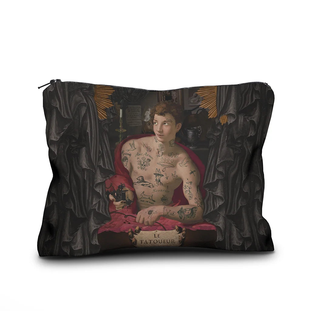 A stunning, high-quality velvet pouch by Voglio Bene, featuring the Tattoo Artist's Kit artwork. Different prints adorn the front and back. Finished with a zip closure and inner lining.