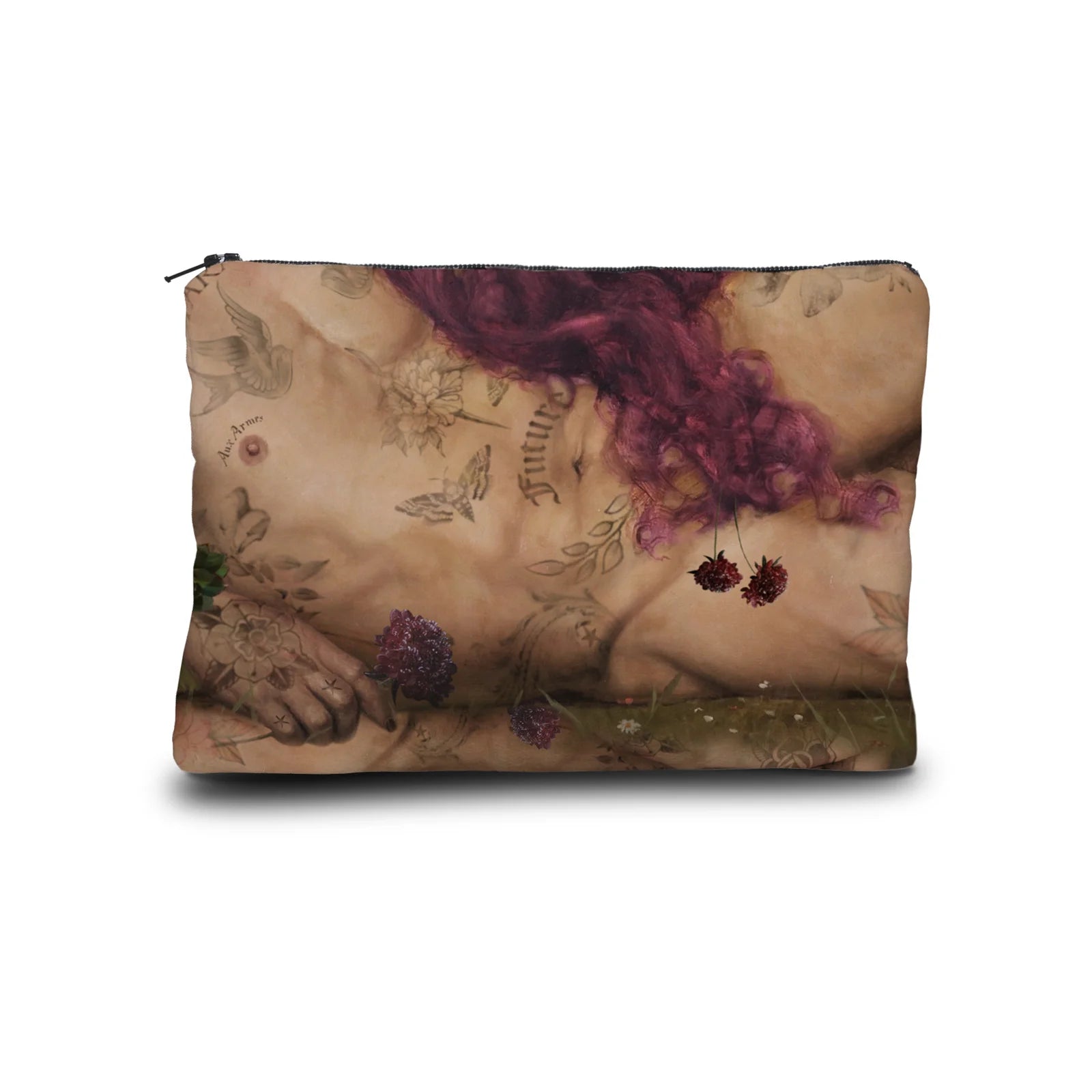 The Voglio Bene purse with Kiss illustration. A tattooed man and woman, Adam and Eve, lie entwined in a garden, kissing amid trees and lions.