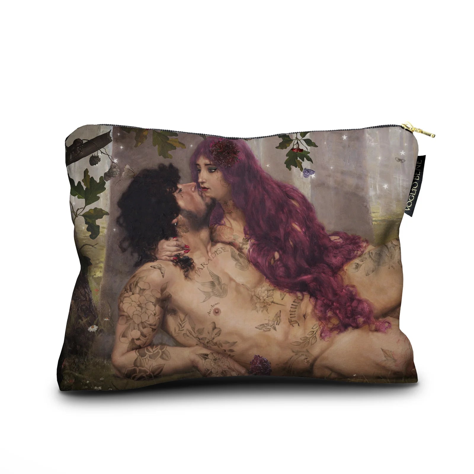 A stunning, high-quality velvet pouch by Voglio Bene, featuring The Kiss artwork. Different prints adorn the front and back. Finished with a zip closure and inner lining.