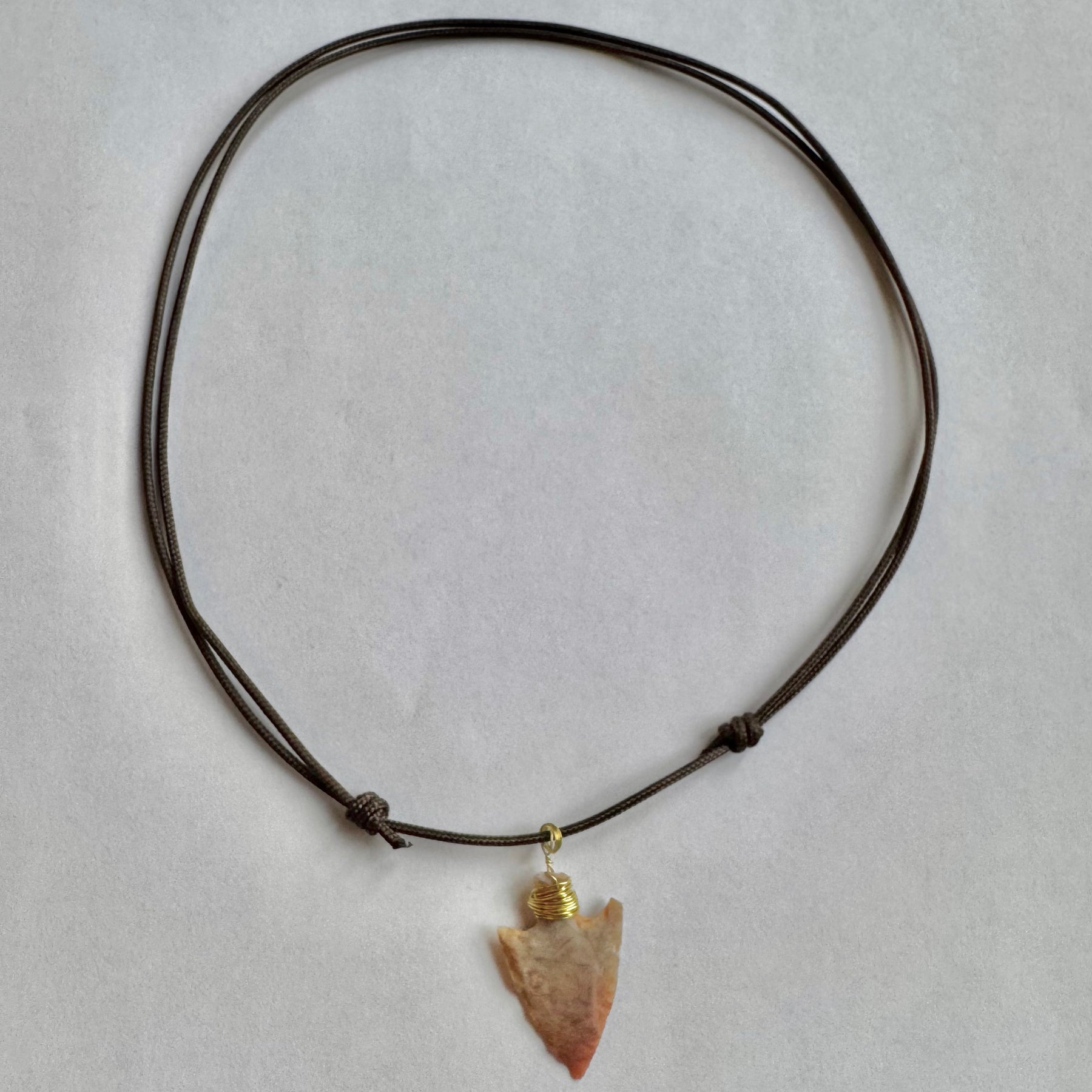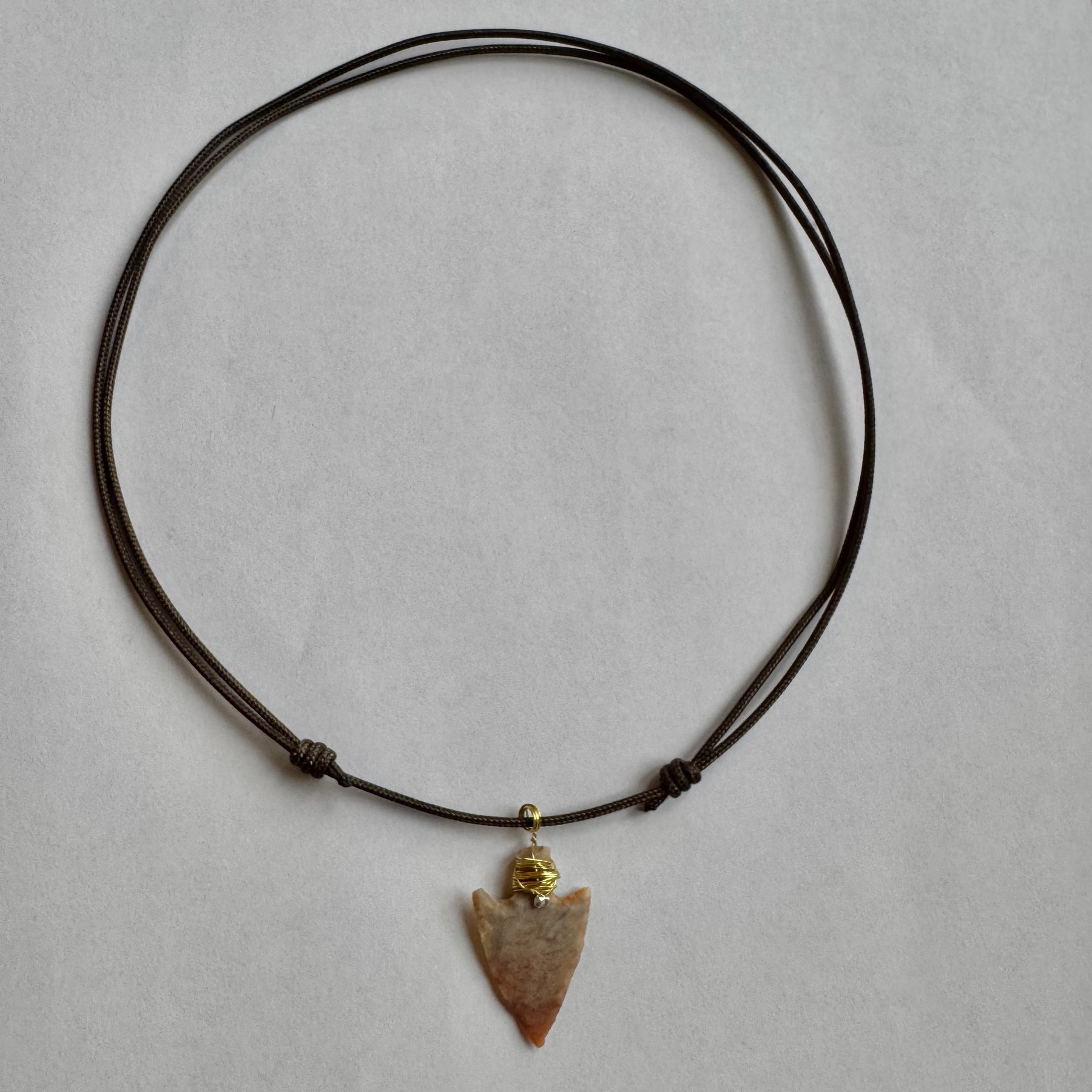 This unique necklace features a Stone Age arrowhead pendant. It is meticulously carved from flint and comes from the Tenerian culture of North Africa, dating back to 5200-2500 BC. Each of these arrowheads is a unique individual, carrying with it a legacy of Stone Age craftsmanship and survival. The synthetic fiber cord gives the piece a discreet and adjustable fastening.