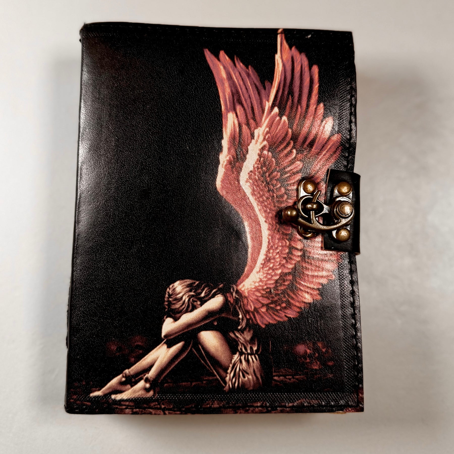 A stunning, rustic leather journal crafted by hand. Its pages are made from handmade paper, offering a unique texture and a distinctive writing experience.