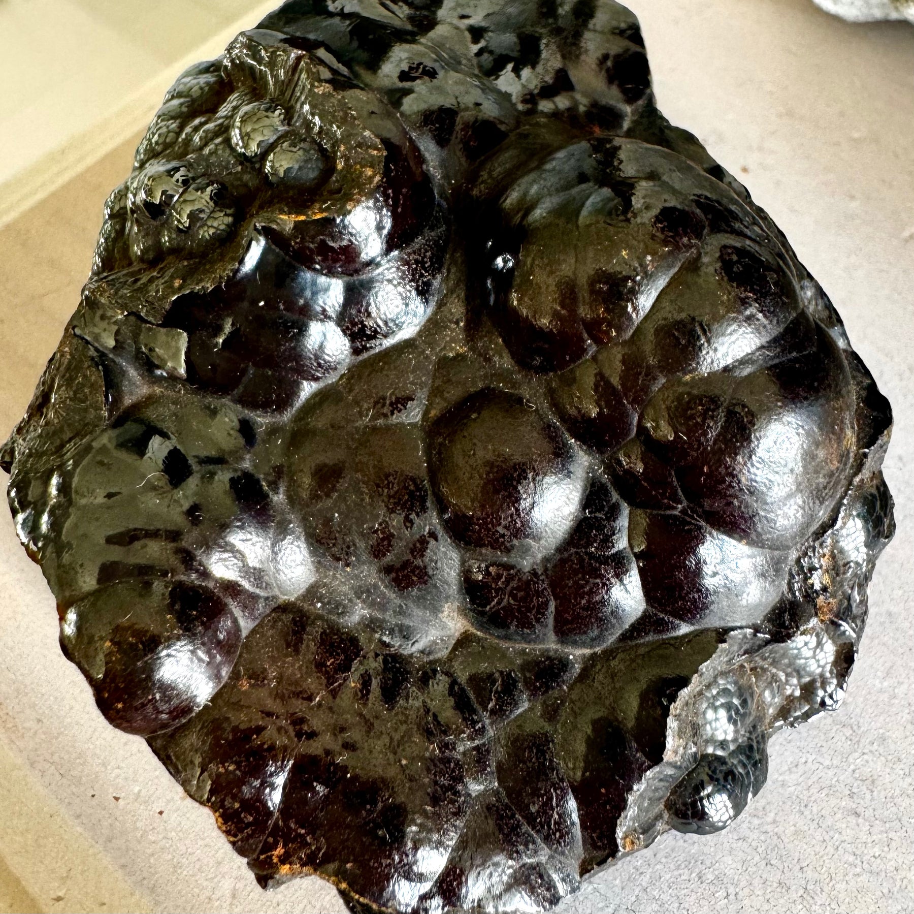 Botryoidal hematite (Fe₂O₃) is a form of hematite in which the mineral has developed in a grape-like pattern. Its surface displays rounded, interconnected mounds that create a smooth, glossy, and almost living texture. This formation occurs as iron-rich solutions slowly precipitate into cavities and fractures, layer by layer, building up spherical growth surfaces. The color ranges from metallic dark grey to deep black, with a characteristically reddish-brown streak.