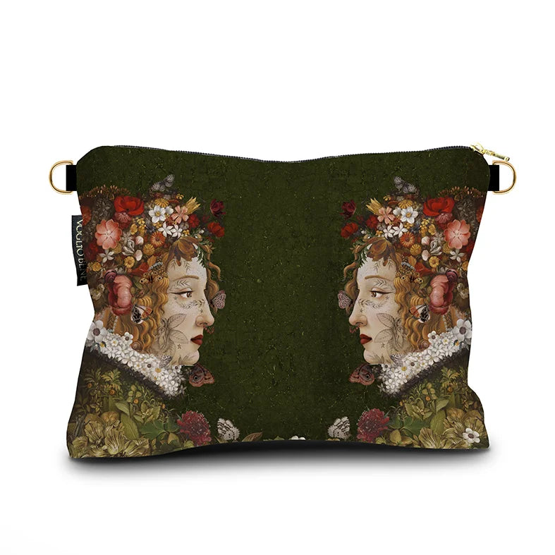 A stunning, high-quality velvet bag by Voglio Bene, featuring the elegant Flora print. The same design appears on both sides. Finished with a zip closure and lined interior.