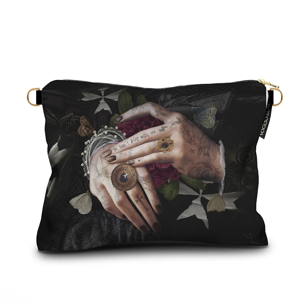 A stunning, high-quality velvet bag by Voglio Bene, featuring the elegant Protection print. The same design appears on both sides. Finished with a zip closure and lined interior.