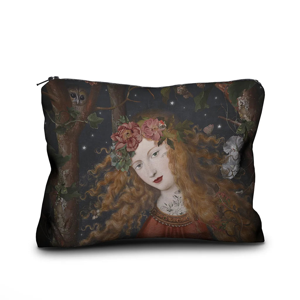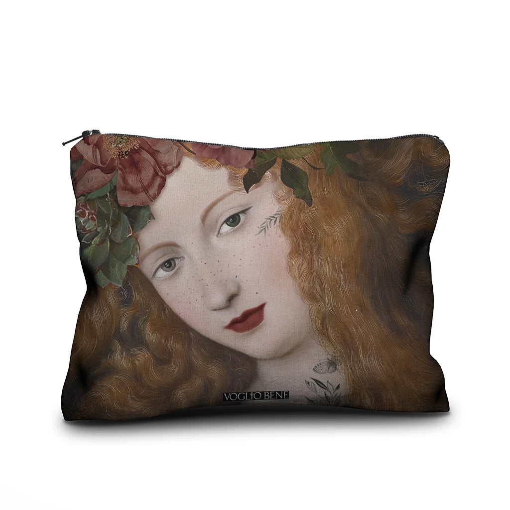 A stunning, high-quality velvet pouch by Voglio Bene, featuring the Autumn artwork. Different prints adorn the front and back. Finished with a zip closure and inner lining.