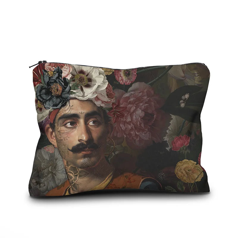 A stunning, high-quality velvet pouch by Voglio Bene, featuring the Hassan artwork. Different prints adorn the front and back. Finished with a zip closure and inner lining.