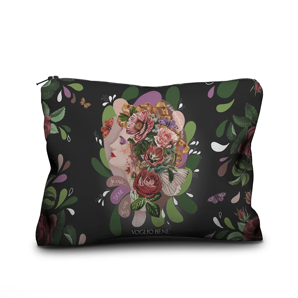 A stunning, high-quality velvet pouch by Voglio Bene, featuring the I Think artwork. Different prints adorn the front and back. Finished with a zip closure and inner lining.