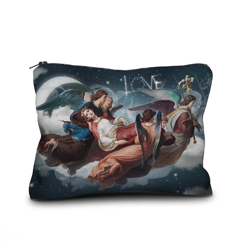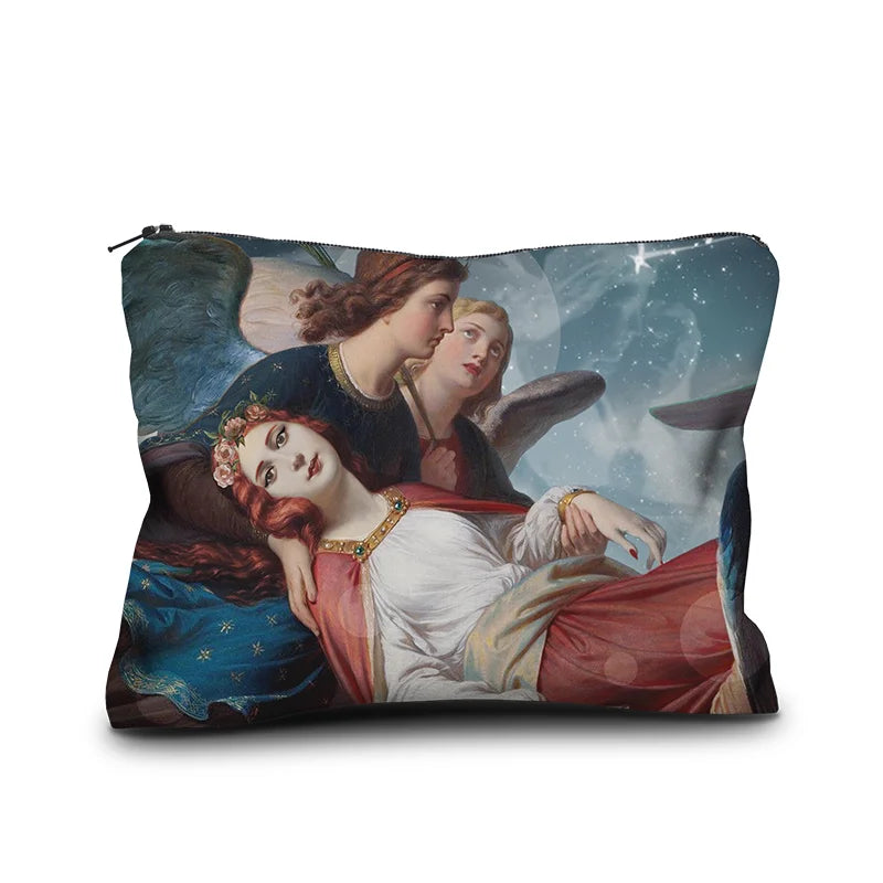 The illustration on this velvet pouch is based on the legendary story of Saint Catherine of Alexandria. Catherine was a 4th-century scholar who courageously defended Christianity. In the image, angels carry her to heaven after her martyrdom. This artistic rendition symbolizes the ascent of her soul from suffering to holiness.