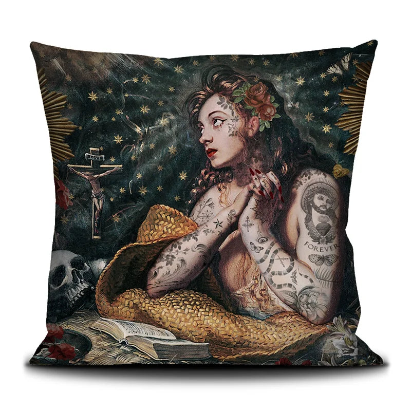 Front view of a Voglio Bene Marie Magdeline cushion. The illustration shows a tattooed woman praying toward the sky, with a crucifix beside her and a skull and stars in the background.