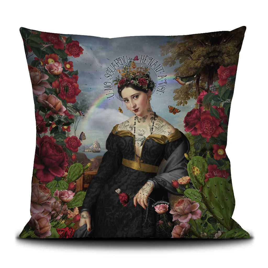 In the image, the front side of a Voglio Bene cushion with the Santa di U Niolu illustration, depicting a tattooed woman in a black dress with a flower crown framed by flowers, with water, a rainbow, and a ship in the background.