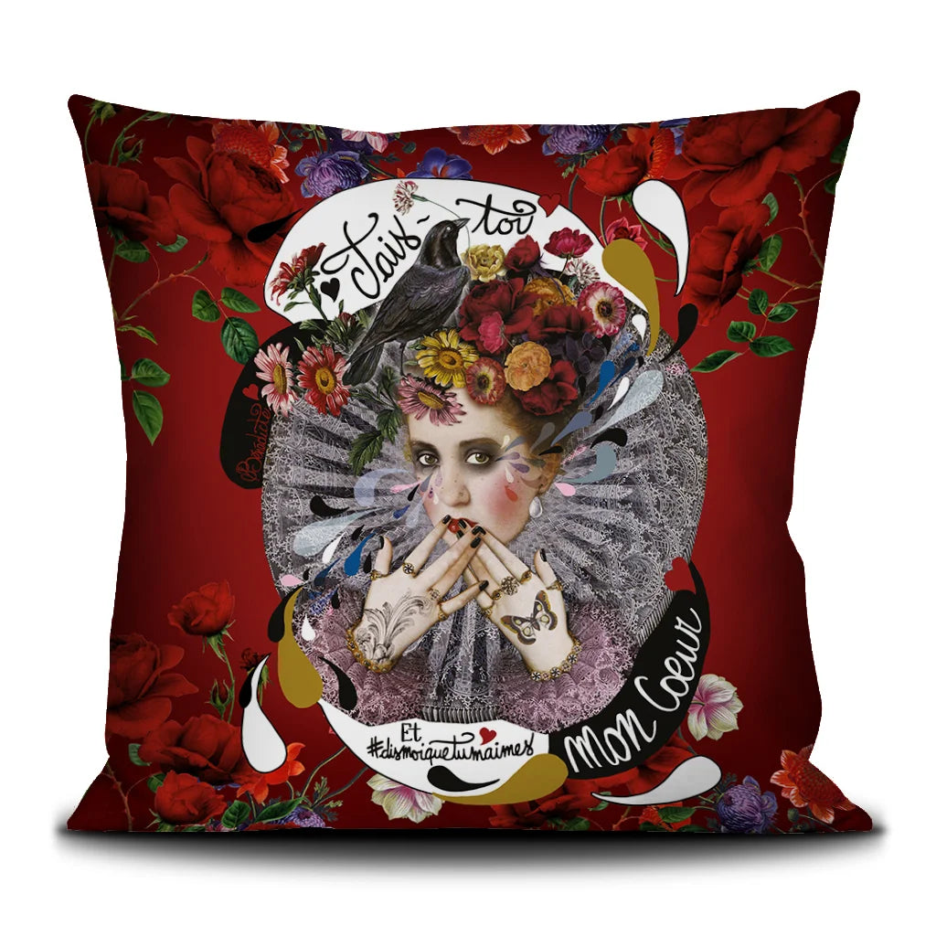 In the image, the front side of a Voglio Bene cushion with the Shut Up illustration, featuring a harlequin-like woman covering her mouth with her hands, wearing a flower crown and surrounded by flowers on a red background.