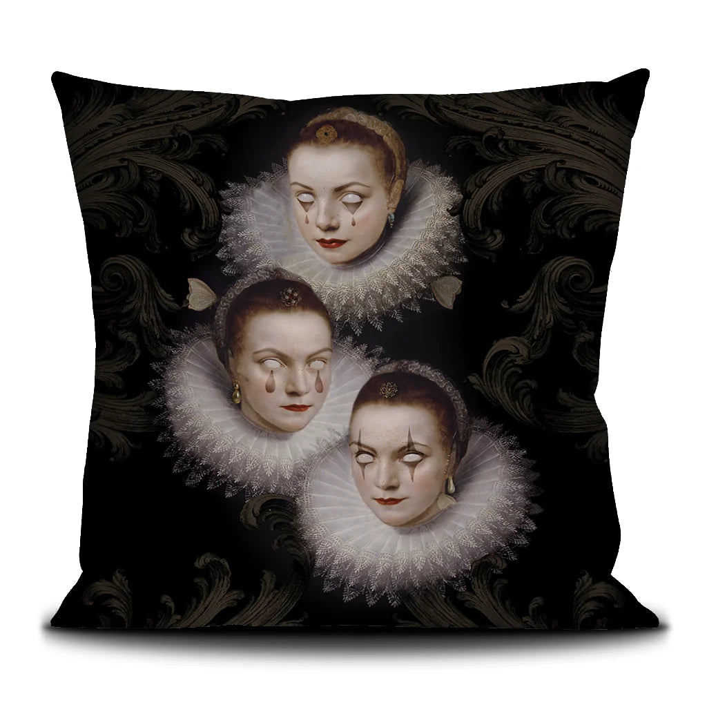 The three Renaissance-era women depicted on the cushion represent members of a shared community bound by a deep connection. Their faces and garments, similar yet distinct, highlight both individuality and unity — each woman is her own person, yet part of something greater. Together, they form a powerful collective, united in life and beyond — a timeless emblem of loyalty, strength, and shared purpose.