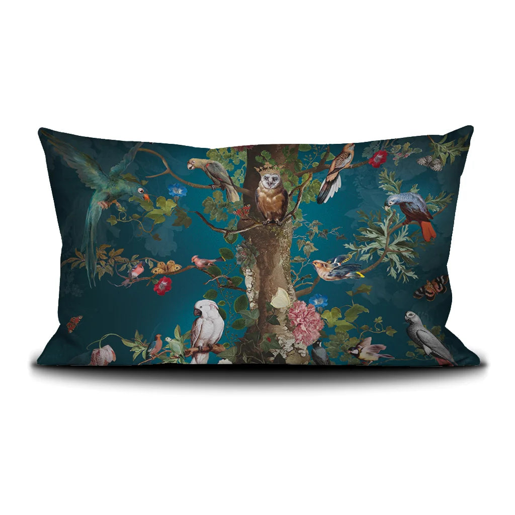 The front view off Voglio Bene cushion with Tree of Life illustration. A tree rises against a blue background, with an owl wearing a crown perched on a branch, surrounded by tropical birds.